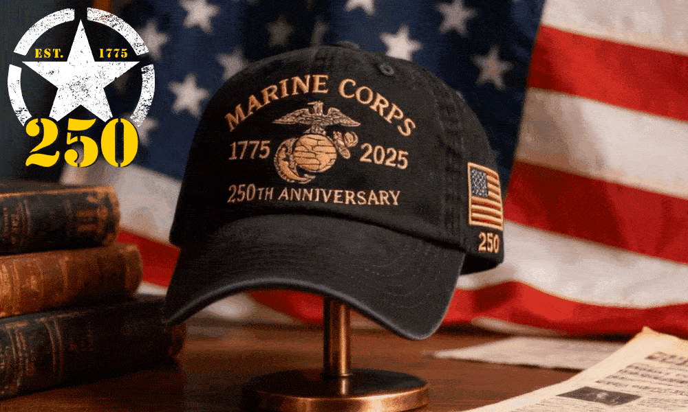 Bold and commanding, honoring service across land and sea with embroidery that shines against its dark backdrop.