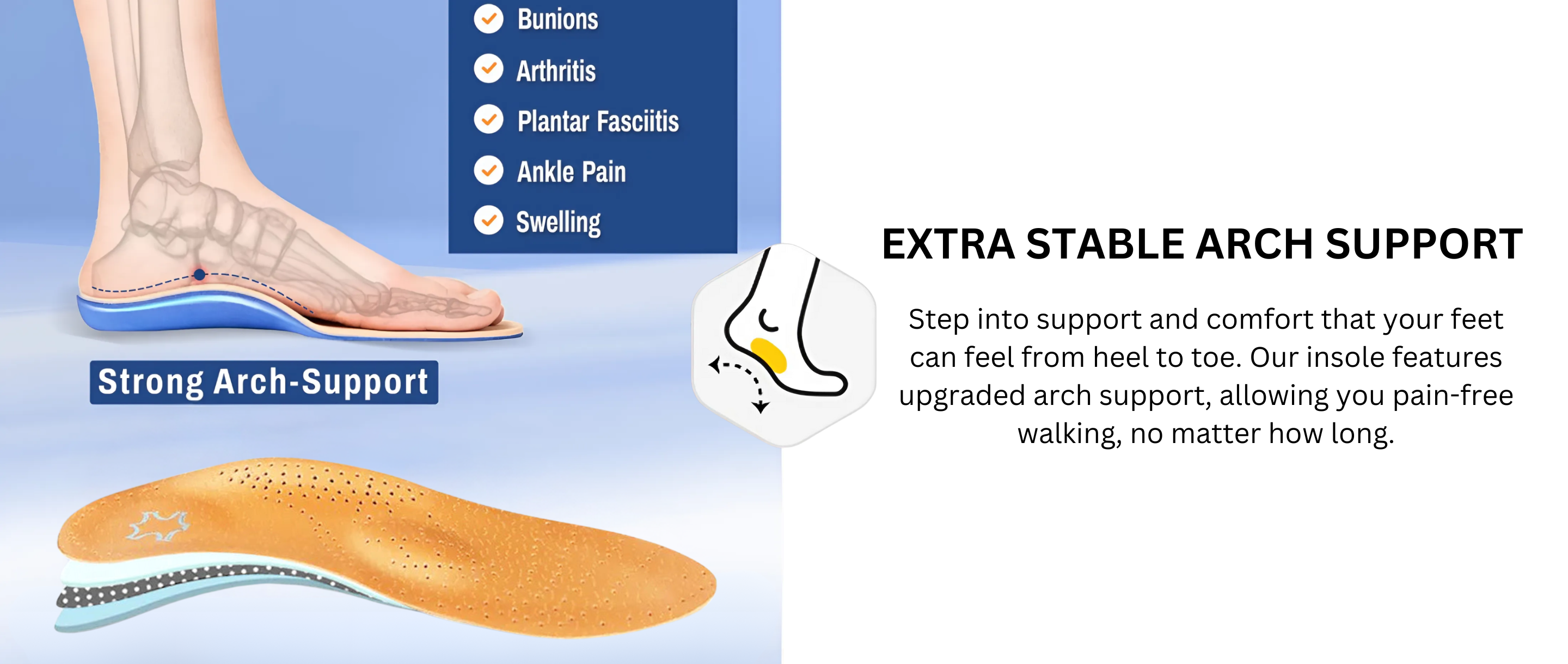 Our shoes are specially designed to provide maximum support and comfort. They feature ergonomic soles and offer extra arch support, which helps alleviate pain and discomfort, especially for those with foot problems such as flat feet, heel spurs, or plantar fasciitis.