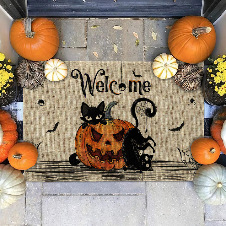 Halloween Welcome Doormat – Outdoor Rug with Pumpkin & Cat Design – Farmhouse Style Front Door Mat for Porch, RV, or Fall Décor