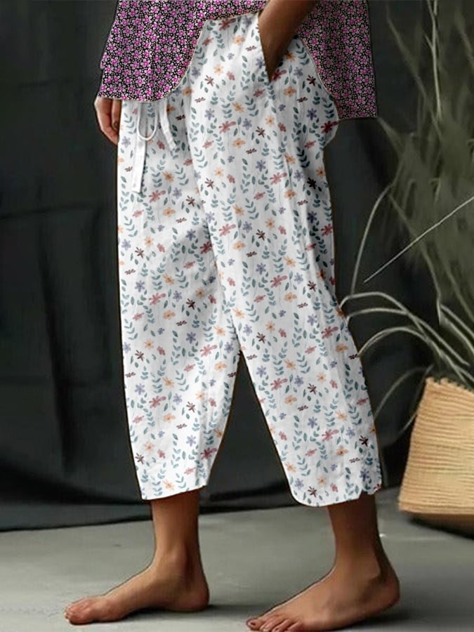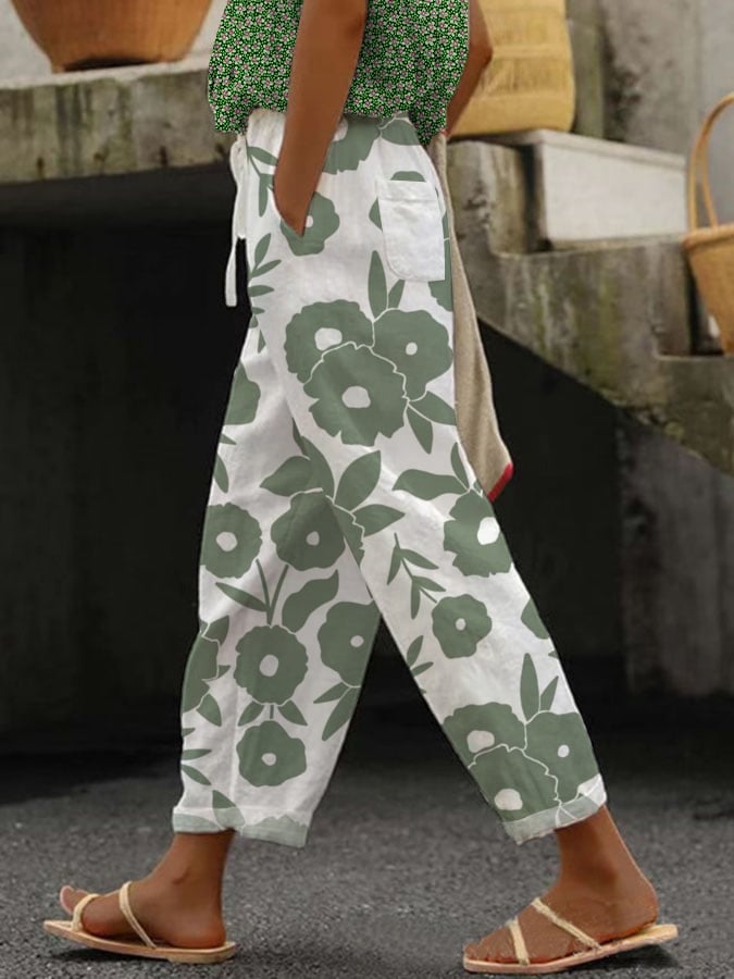 Women's Botanical Floral Design Loose Pocket Patchwork Casual Pants