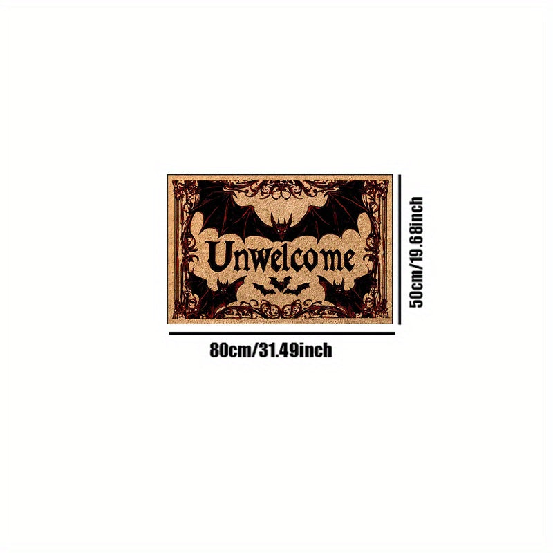 This Halloween-themed doormat is the perfect spooky statement piece for your front door. Featuring a bold gothic “Unwelcome” greeting in black lettering, the mat sets a delightfully eerie tone for guests and trick-or-treaters. The design includes a collection of large, menacing bats with glowing red eyes, detailed wings, and swirling vintage-style border flourishes that frame the entire mat. Made from durable, textured material resembling natural coir, it’s ideal for scraping off dirt while adding a decorative flair. The background mimics a rustic tan fiber, creating a strong contrast against the dark, vivid artwork. This doormat is both functional and festive, ideal for indoor or outdoor use during the Halloween season.