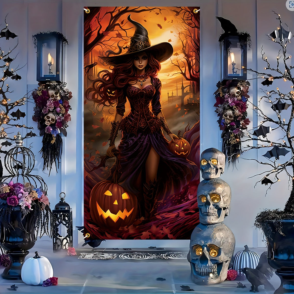 Add a bold, mystical touch to your Halloween decor with this eye-catching Halloween Witch Door Banner. Designed to captivate all who pass by, the banner features a stunning illustration of a seductive sorceress in a dramatic dark gown and wide-brimmed witch hat. She stands amidst a haunting autumnal landscape, holding a glowing jack-o'-lantern in each hand as swirling leaves and bare trees fill the background under a fiery sunset sky. The vibrant orange and deep purple tones create a warm yet eerie glow that perfectly complements the Halloween season. Measuring large enough to become the centerpiece of any porch or doorway, this high-resolution banner is printed on durable, weather-resistant fabric and comes with corner grommets for easy hanging. Ideal for front doors, entryways, patios, or even indoor party backdrops, this banner sets the scene for a spellbinding Halloween night. Surrounding décor elements such as skull towers, gothic wreaths, and bat trees in the image enhance the overall spooky vibe and help visualize a complete Halloween setup.