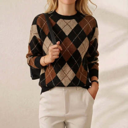 Cotton Sweater with Diamond Pattern Brown-Black