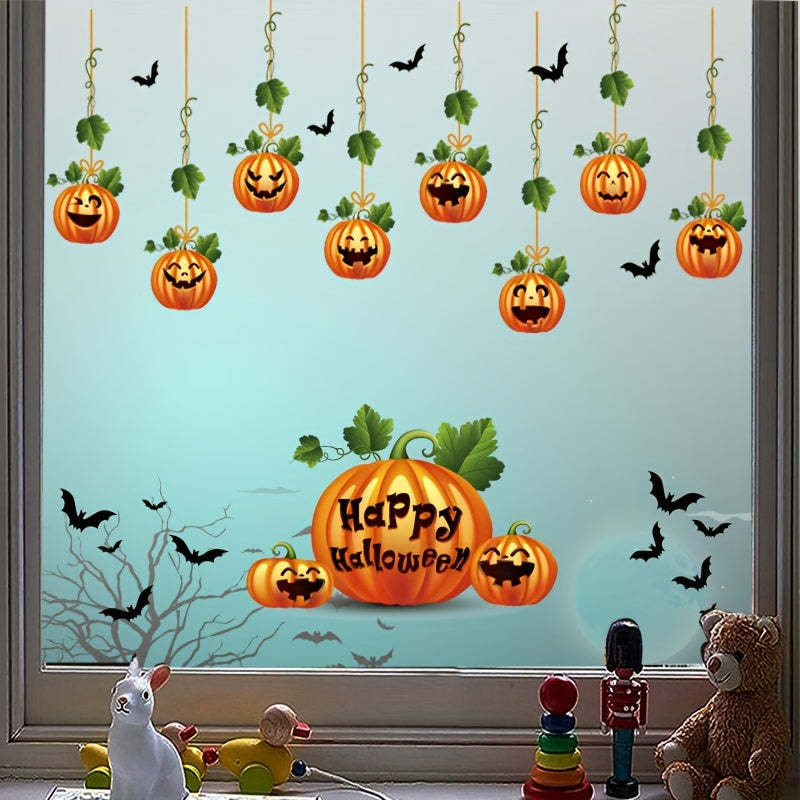 Add a festive and spooky touch to your home with this 10-Pack Halloween Window Stickers set, perfect for creating a fun and welcoming seasonal atmosphere. Each set features a mix of large and small pumpkin designs with cheerful and mischievous jack-o'-lantern faces, accompanied by fluttering black bats for a spooky accent. The centerpiece stickers include larger pumpkins with the words "Happy Halloween" printed in bold, playful lettering, making them ideal for window centers or entryways. Smaller pumpkins hang by illustrated green vines, creating the illusion of dangling decorations. Made from high-quality, reusable PVC material, these decals are easy to apply and remove without leaving residue, making them safe for glass, mirrors, and other smooth surfaces. Whether you're decorating for a party or just want to give trick-or-treaters a warm welcome, these vibrant and eye-catching stickers will transform your windows into a Halloween scene everyone will love.