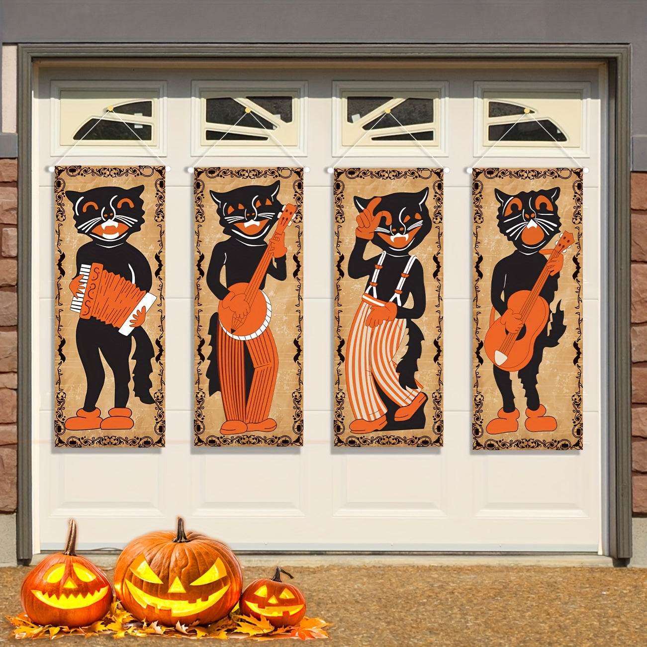 Transform your indoor or outdoor spaces into a spooky, nostalgic Halloween scene with our large set of 4 vintage-style portraits featuring whimsical cats playing musical instruments. Perfect for your front door, garage, or party backdrop.