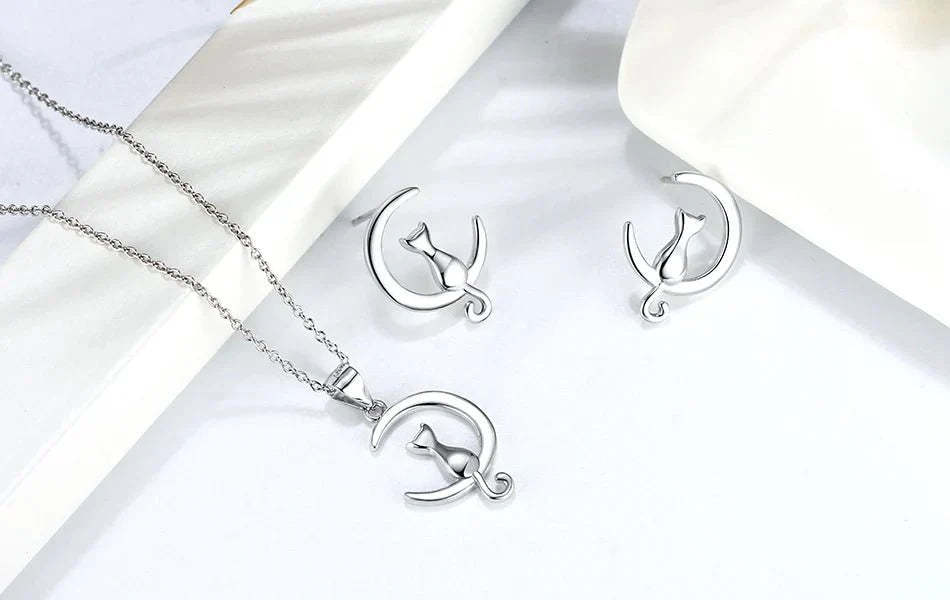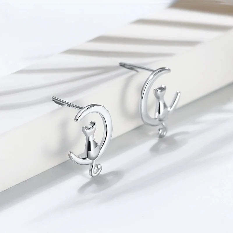 Moon & Cat Sterling Silver Stud Cat Earrings